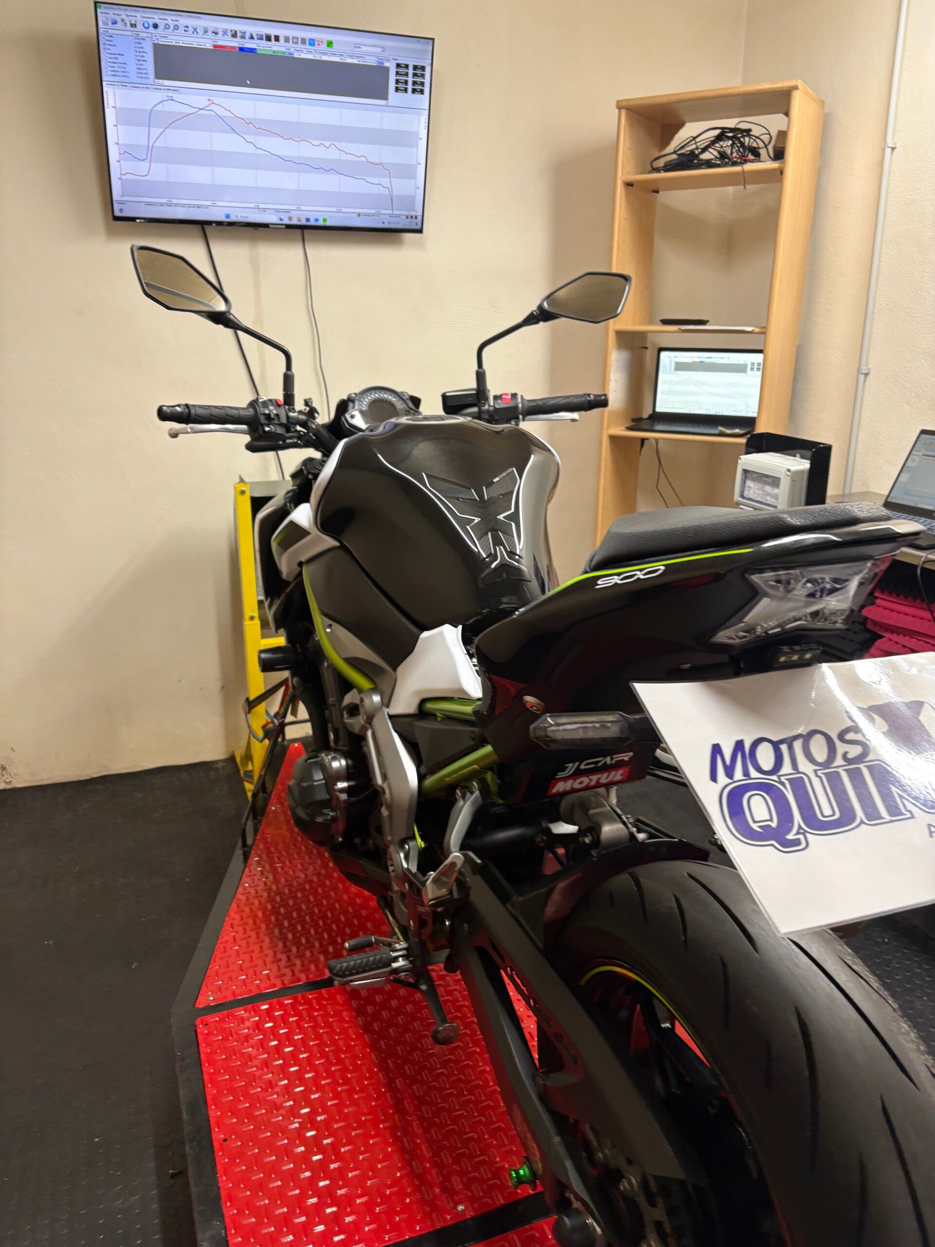 En Motos Quinto contamos con banco de potencia, una herramienta clave para el ajuste preciso, la optimización del rendimiento y la fiabilidad de cada motocicleta, tanto para uso en calle como en competición.